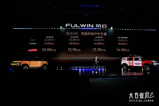 9月17日,風云X3L于成都舉行上市發布會,正式售價為10.99萬元起,共推出四個版本車型,135暢行版售價10.99萬元、215遠行版售價12.19萬元、215智行版售價13.39萬元、205四驅高能版售價14.99萬元。同時,六大官改版型同步亮相。[
