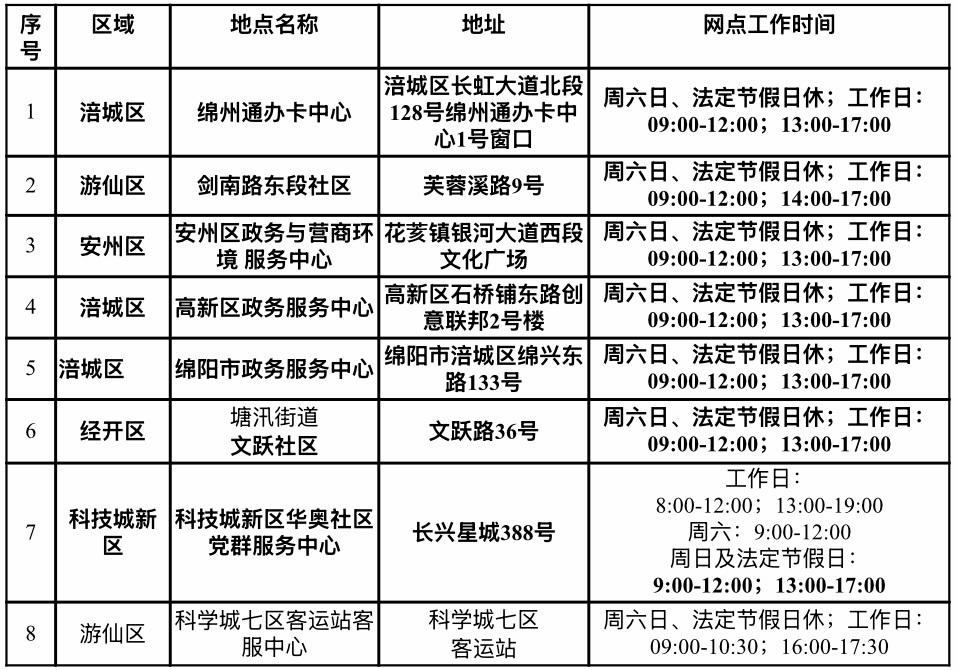 綿州通辦卡中心(涪城區(qū)長(zhǎng)虹大道北段128號(hào)1號(hào)窗口),服務(wù)咨詢(xún)電話(huà)可撥打0816-2244123或0816-2123666。