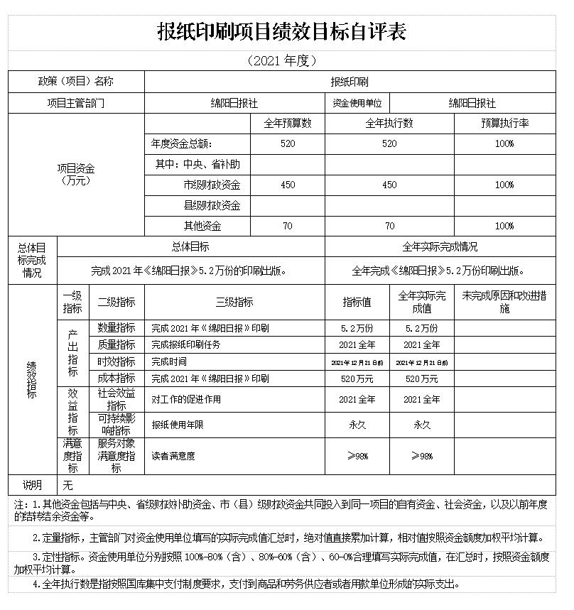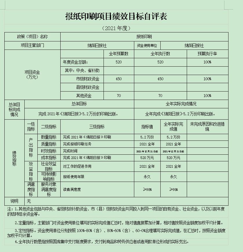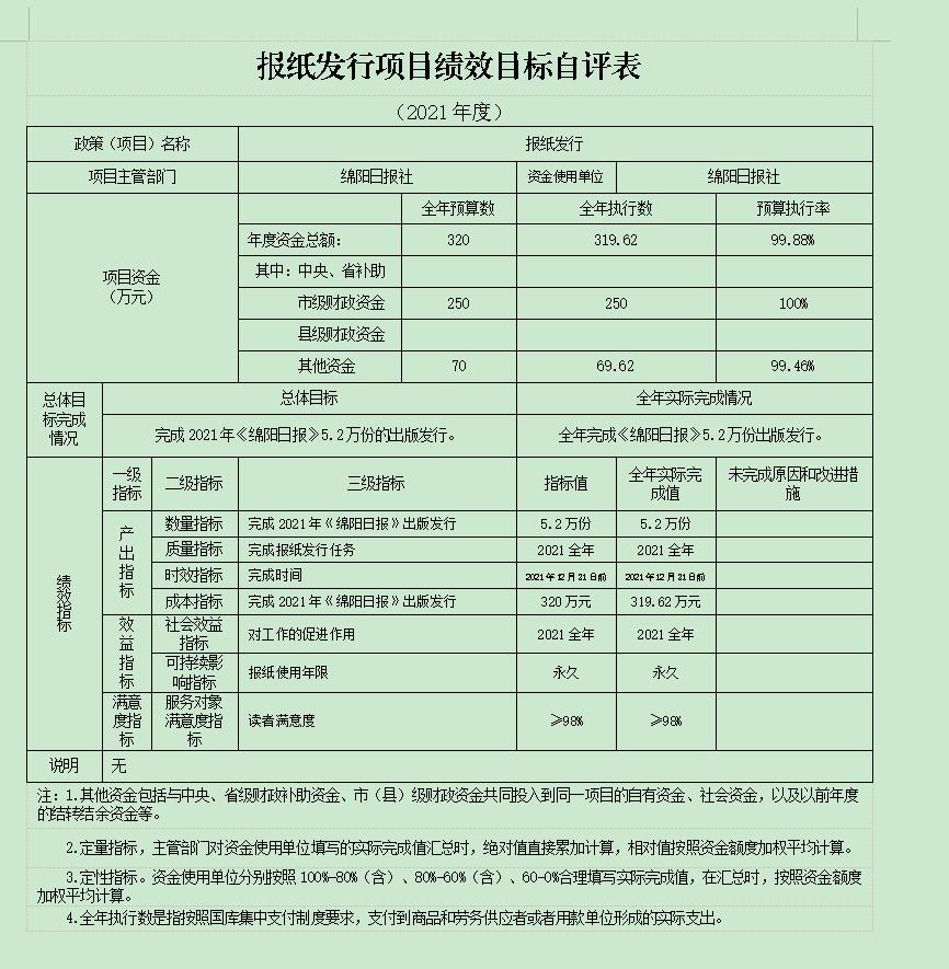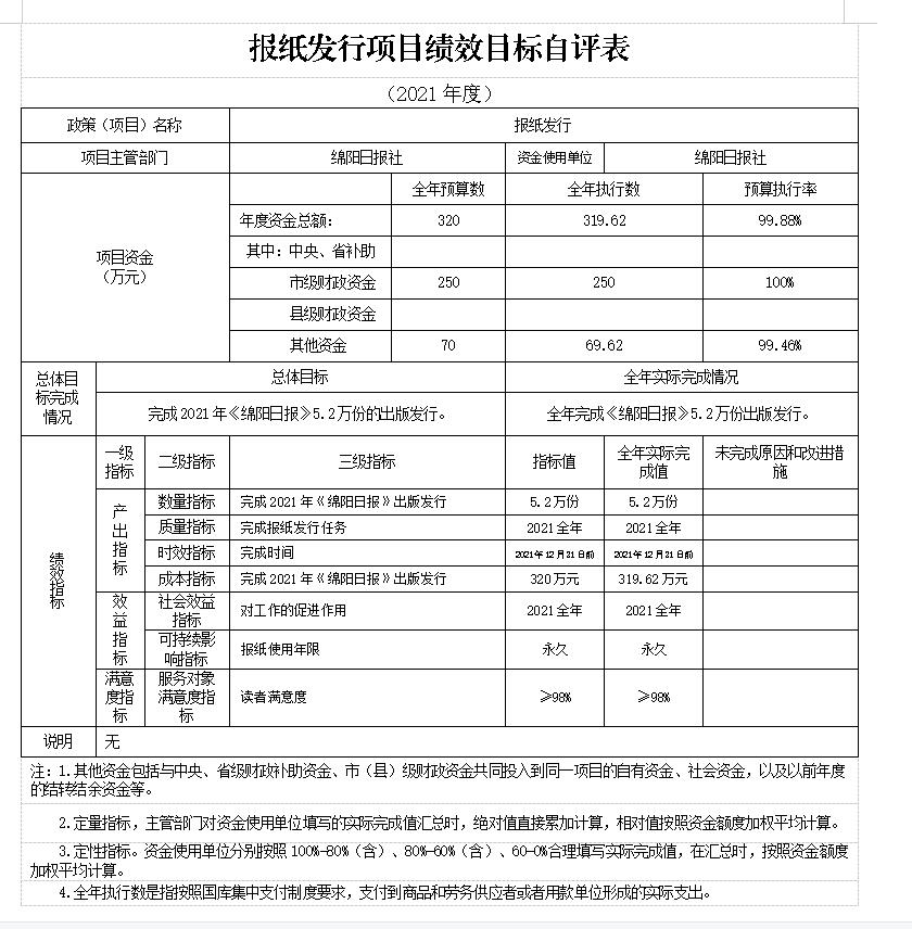 2021年我單位對“報紙印刷”、“報紙發行”、“《綿陽政事》《綿陽發布》工作經費”項目進行了績效自評,將評價結果應用到次年的項目預算申報及項目績效管理中,從運行成本、管理效率等方面,衡量報社核心項目的實施效果。并按規定時限在門戶網站及時公開了項目支出績效自評報告。