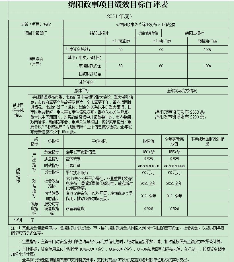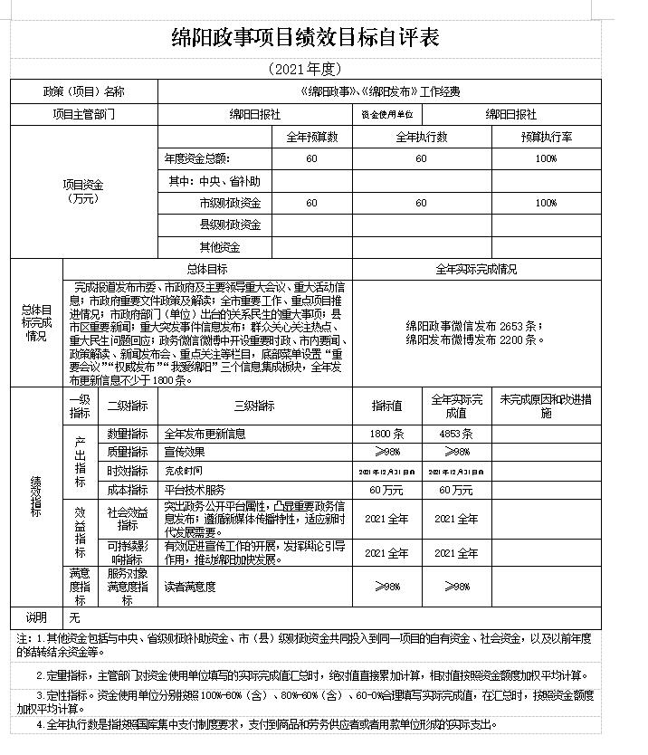 3、《綿陽政事》《綿陽發布》工作經費項目年初財政撥款預算數60.00萬元,執行數為60.00萬元,完成年初預算的100%。通過項目實施,完成報道發布市委、市政府重大會議、重大活動信息;市政府重要文件政策及解讀;全市重要工作、重點項目推進情況;市政府部門(單位)出臺的、政府信息公開關系民生的重大事項;縣市區重要新聞;重大突發事件信息發布;群眾關心關注熱點、重大民生問題回應;政務微信微博中開設重要時政、市內要聞、政策解讀、新聞發布會、重點關注等欄目,底部菜單設置“重要會議”“權威發布”“我愛綿陽”三個信息集成板塊,全年發布更新信息達到了綿陽政事微信發布2653條,綿陽發布微博發布2200條。2021年《綿陽政事》被省委網信辦、省政府新聞辦等部門評為“微政四川2021年度優秀政務公開典型案例”。