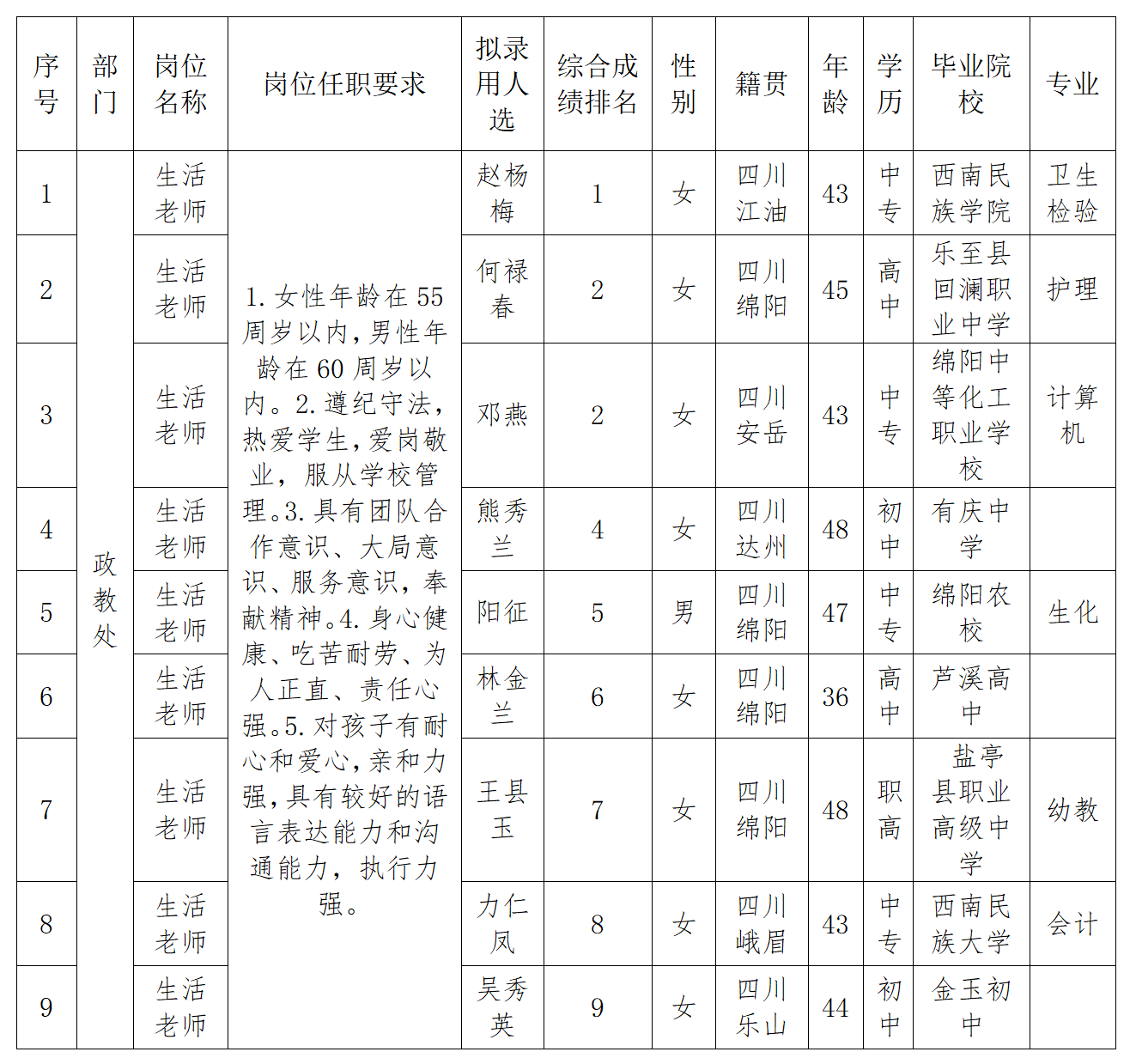綿陽南山中學(xué)實驗學(xué)校關(guān)于招聘生活老師擬錄用人員的公示