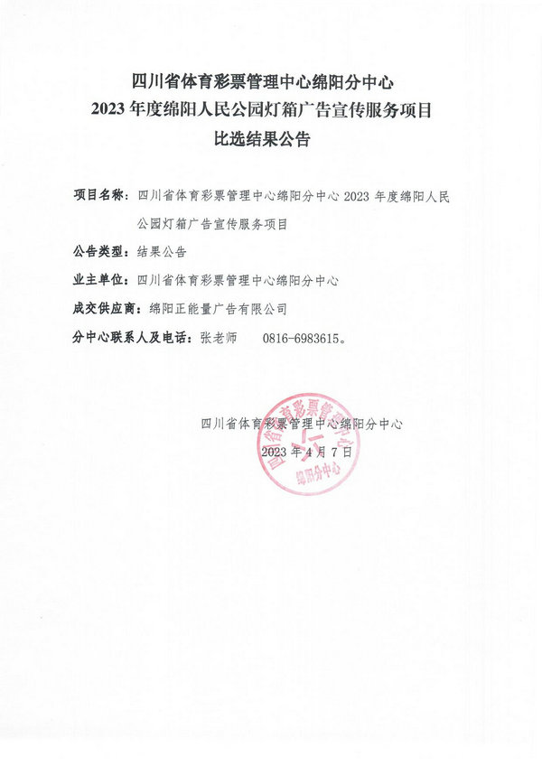 四川省體育彩票管理中心綿陽分中心2023年度綿陽人民公園燈箱廣告宣傳服務項目比選結果公告