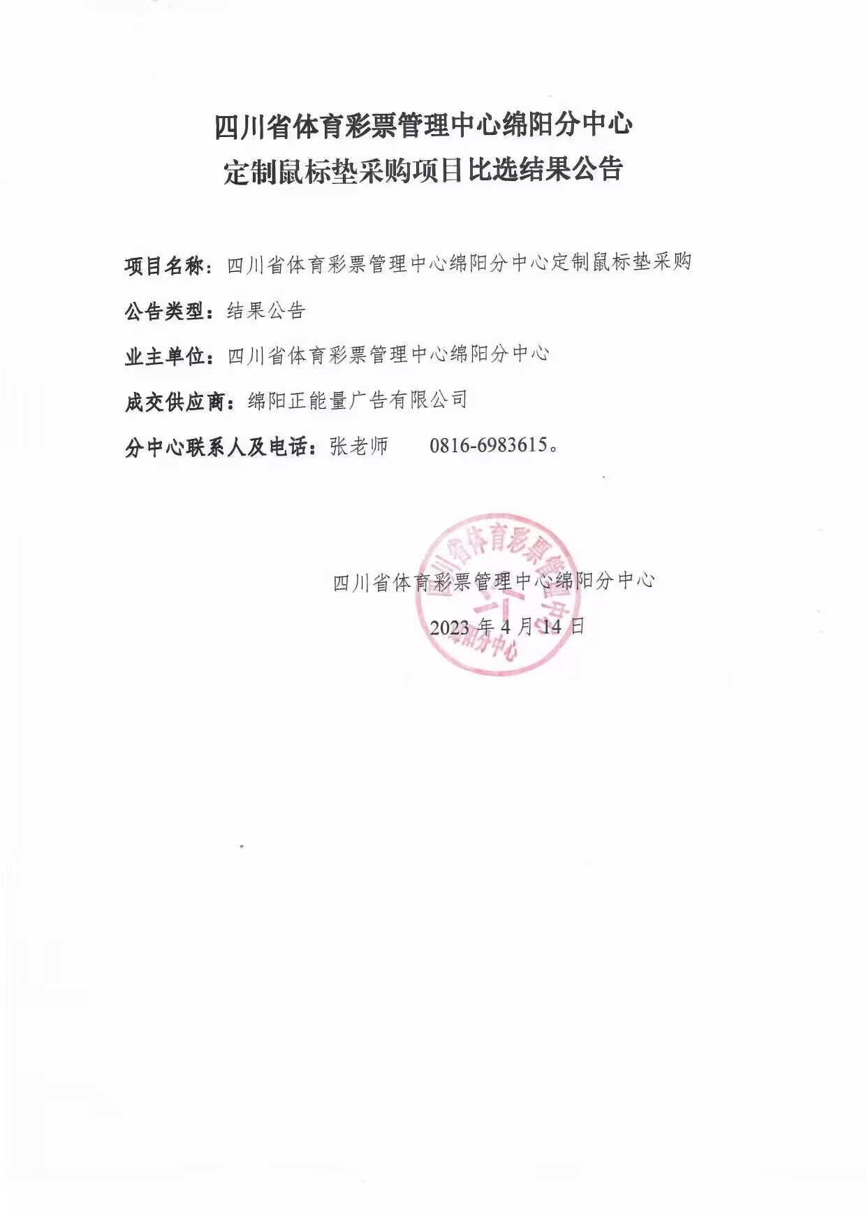 四川省體育彩票管理中心綿陽分中心定制鼠標墊采購項目比選結果公告