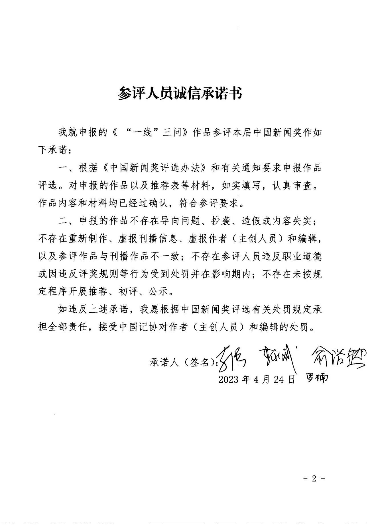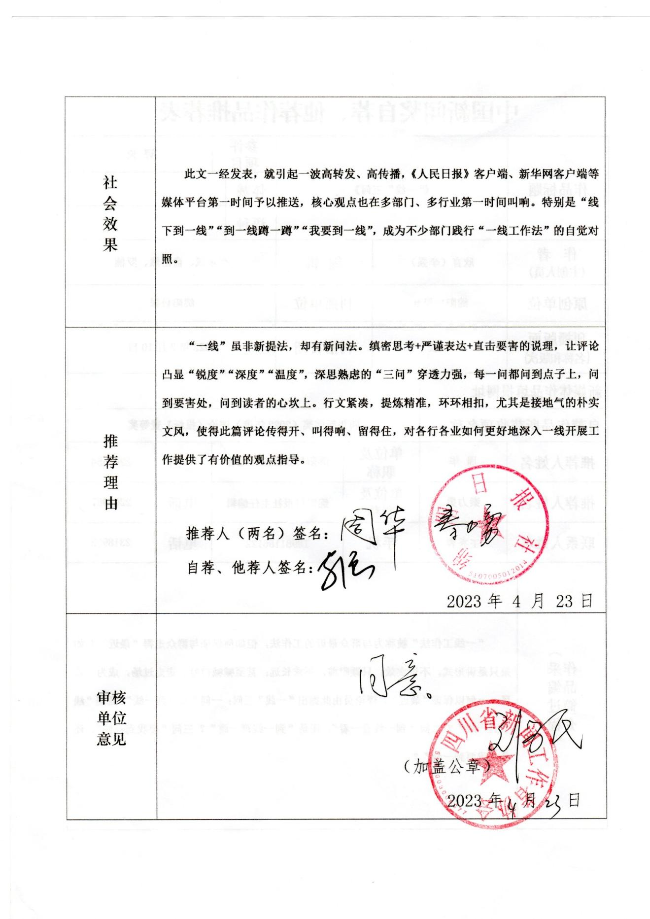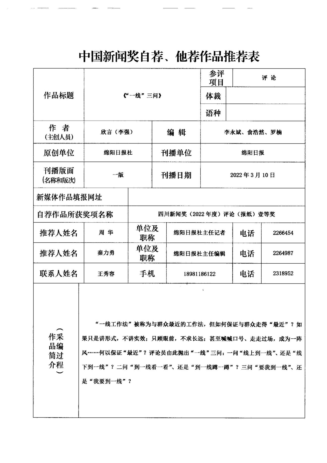 根據《中國新聞獎評選辦法》和《第33屆中國新聞獎參評作品報送通知》,由綿陽日報社記者李強撰寫,李永斌、俞浩然、羅楠編輯的評論作品《“一線”三問》擬自薦參評第33屆中國新聞獎。現將作品相關信息進行公示,公示期為5天。在此期間,如有異議,可通過電話、郵件等方式反映。