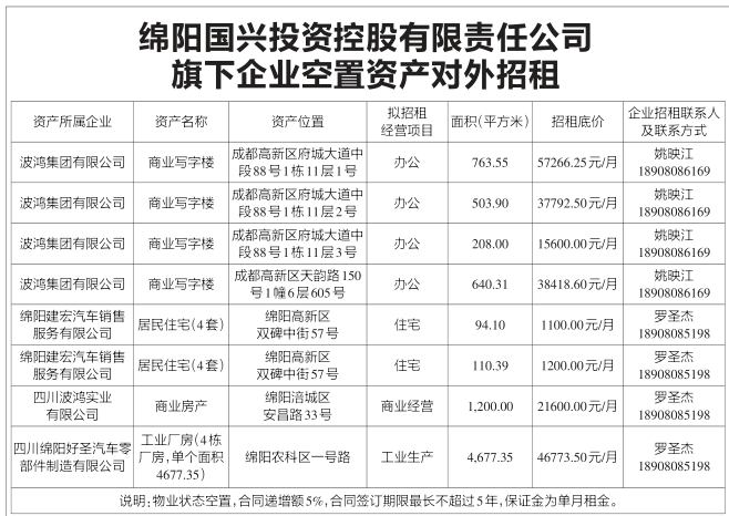綿陽(yáng)國(guó)興投資控股有限責(zé)任公司旗下企業(yè)空置資產(chǎn)對(duì)外招租