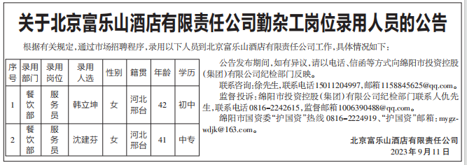 關于北京富樂山酒店有限責任公司勤雜工崗位錄用人員的公告