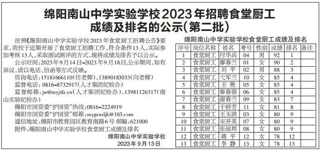 綿陽南山中學(xué)實(shí)驗(yàn)學(xué)校2023年招聘食堂廚工成績及排名的公示(第二批)
