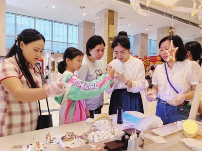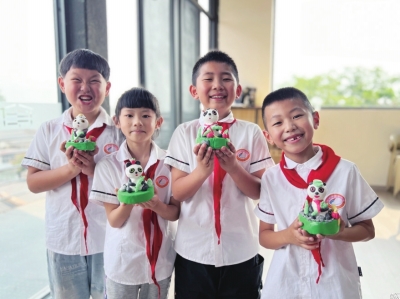 在涪城區新時代文明實踐中心組織的“喜迎國慶樂享非遺”文明實踐主題活動中,孩子們展示制作的非遺作品。 (葛楚涵 記者 尹秦 王澤宇攝)