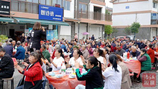 活動現場,村民們載歌載舞頌歌新時代,歡度重陽節。節目表演結束后,老人們圍坐在一起,吃壩壩宴、嘮家常,流淌著濃濃的幸福味道。