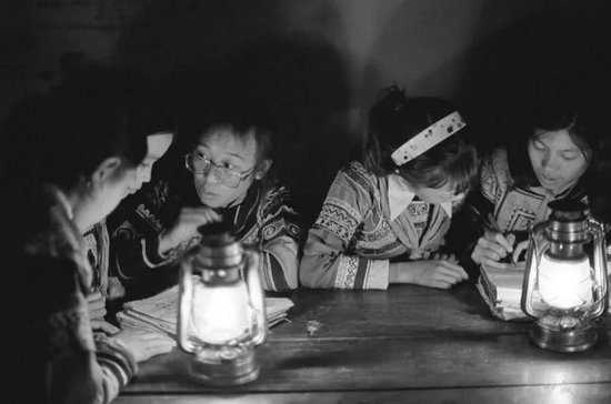 1992年9月,東山鄉(xiāng)中心小學(xué)老師在馬燈下輔導(dǎo)學(xué)生。
