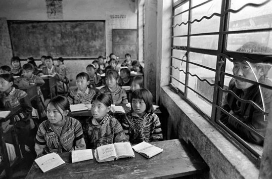 1992年9月,東山鄉(xiāng)中心小學(xué)女子班的孩子們正在上課,一位父親透過破粹的玻璃窗看向教室。