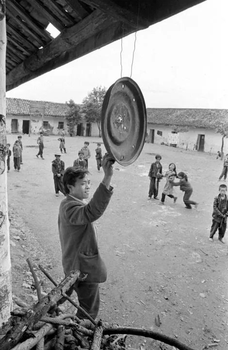 1992年9月的東山鄉(xiāng)中心學(xué)校,老師敲擊汽車輪轂代替上課鈴聲。新華社記者陳燮攝