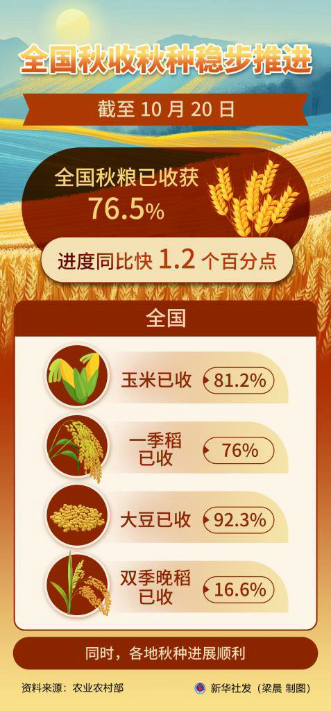 新華社北京10月21日電(記者于文靜)目前,全國秋收秋種正穩(wěn)步推進(jìn)。截至10月20日,全國秋糧已收獲76。5%,進(jìn)度同比快1。2個(gè)百分點(diǎn)。