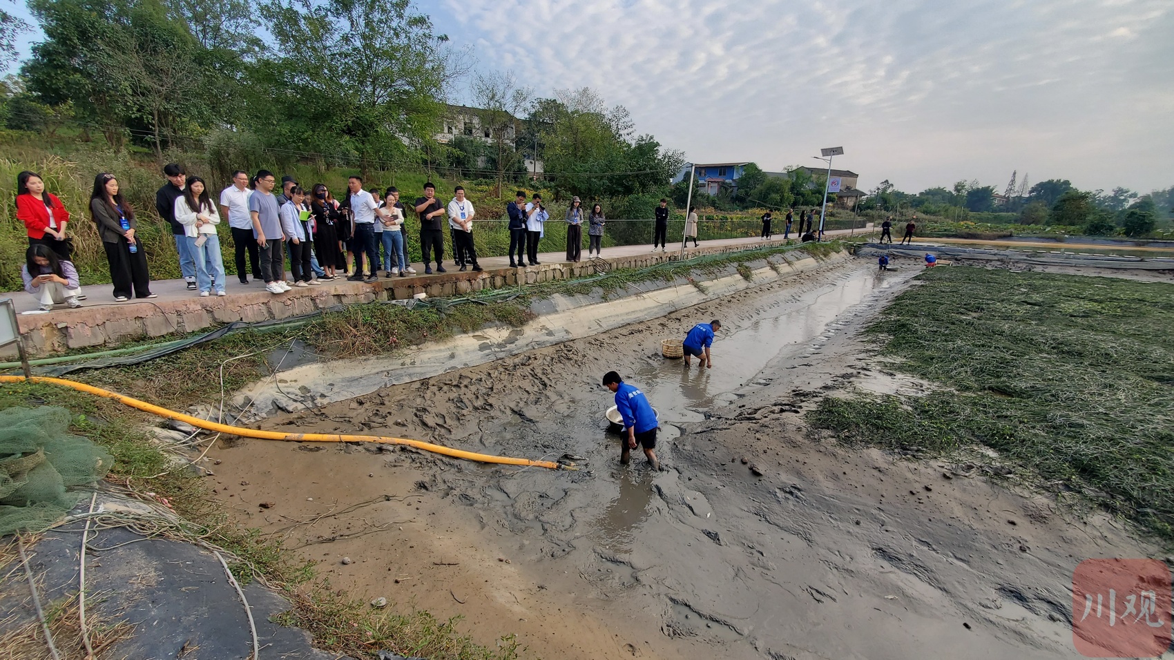 參加“奮楫爭上游·改革‘四重’奏——‘川渝一盤棋·唱好雙城記’”網絡主題活動的媒體記者們來到瀘州市瀘縣玄灘鎮稻蝦養殖基地。