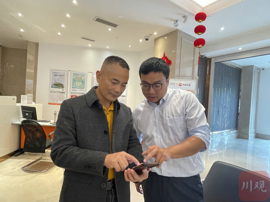 雅安市創業者齊天(左)在金融機構工作人員指點下,通過手機在網上申請創業擔保貸款