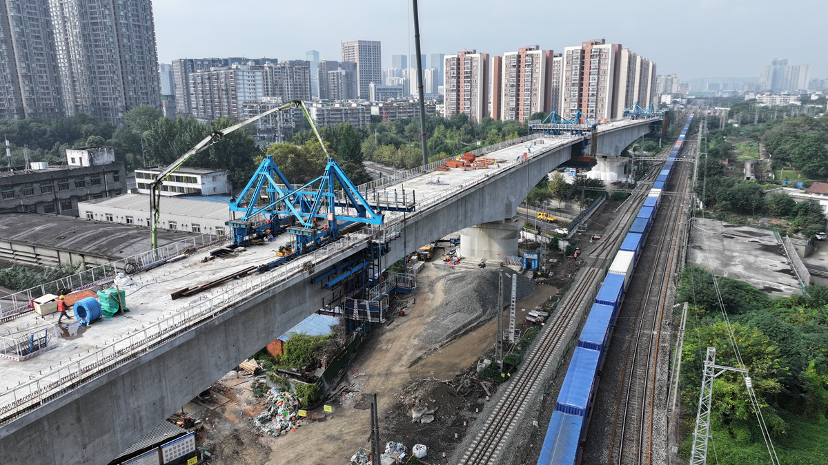 成渝中線高鐵動走線跨沙河特大橋位于四川省成都市金牛區(qū),全長約1.47公里,以現(xiàn)澆連續(xù)梁方式跨越沙河、既有駟馬橋城市主干道路、成都地鐵3號線及新建客機(jī)整備所西咽喉區(qū)。其中,主跨采用“掛籃懸臂澆筑施工法”施工,施工人員將連續(xù)梁分為14個標(biāo)準(zhǔn)節(jié)段施工,共澆筑混凝土9000余立方米,相當(dāng)于約4個奧運會標(biāo)準(zhǔn)游泳池的容量。