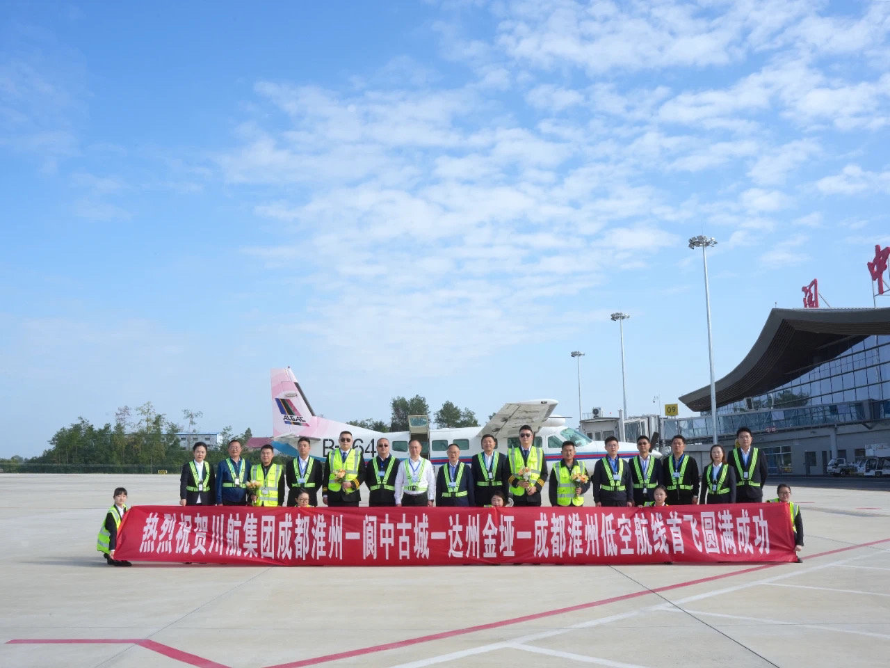 10月23日,一架賽斯納208B型飛機從成都起飛,經過1小時飛行后,平穩降落在閬中機場,短暫停留后又飛往達州,實現“成都—閬中—達州”低空短途運輸航線首飛。