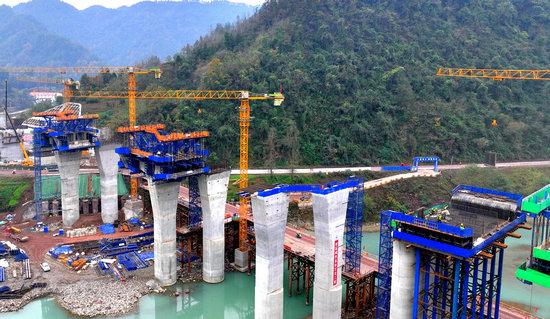 建設(shè)中的西渝高鐵樊噲站1號(hào)六線特大橋。中鐵六局西渝高鐵康渝項(xiàng)目部供圖