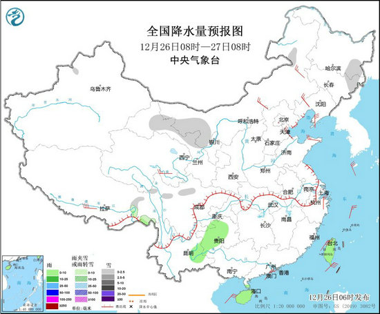 12月26日08時至27日08時,西藏東南部、川西高原北部、甘肅河西、內蒙古西部、黑龍江東南部、吉林東北部等地部分地區有小雪或雨夾雪。四川盆地東南部、貴州中西部、云南東部、海南島、臺灣島等地部分地區有小雨。青海南部、內蒙古中東部、遼寧西部、遼東半島、山東半島、浙江東部沿海等地部分地區有4~6級風。