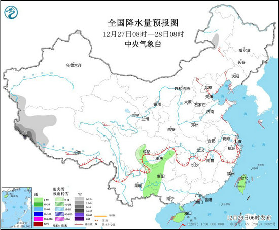 12月27日08時至28日08時,新疆南疆盆地西部、西藏北部和西南部、川西高原南部等地部分地區有小到中雪或雨夾雪,其中,西藏西南部等地部分地區有大到暴雪,局地大暴雪(20~25毫米)。湖北西南部、重慶東南部、四川盆地西部和東南部、貴州中西部、云南東部、廣西西北部、海南島、臺灣島等地部分地區有小雨。西藏中北部、青海南部、內蒙古中東部、山西、河北北部、山東半島等地部分地區有4~6級風;渤海南部、渤海海峽、黃海大部海域、東海東部和南部海域、臺灣海峽、臺灣以東洋面、巴士海峽、南海北部和中部海域、北部灣將有7~8級、陣風9~10級的大風。