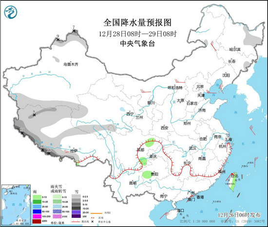 12月28日08時至29日08時,新疆北疆北部、西藏北部和西南部、青海南部和西部、黑龍江東北部、吉林東部等地部分地區有小到中雪,其中,新疆北疆北部高海拔地區、西藏西南部等地部分地區有大到暴雪,西藏西南部局地大暴雪(20~25毫米)。四川盆地北部和西南部、貴州西南部、臺灣島東部等地部分地區有小雨。西藏南部、內蒙古中西部、遼東半島、浙江東部沿海等地部分地區有4~6級風;黃海南部海域、臺灣海峽、臺灣以東洋面、巴士海峽、南海北部和中部海域、北部灣將有7~8級、陣風9~10級的大風。