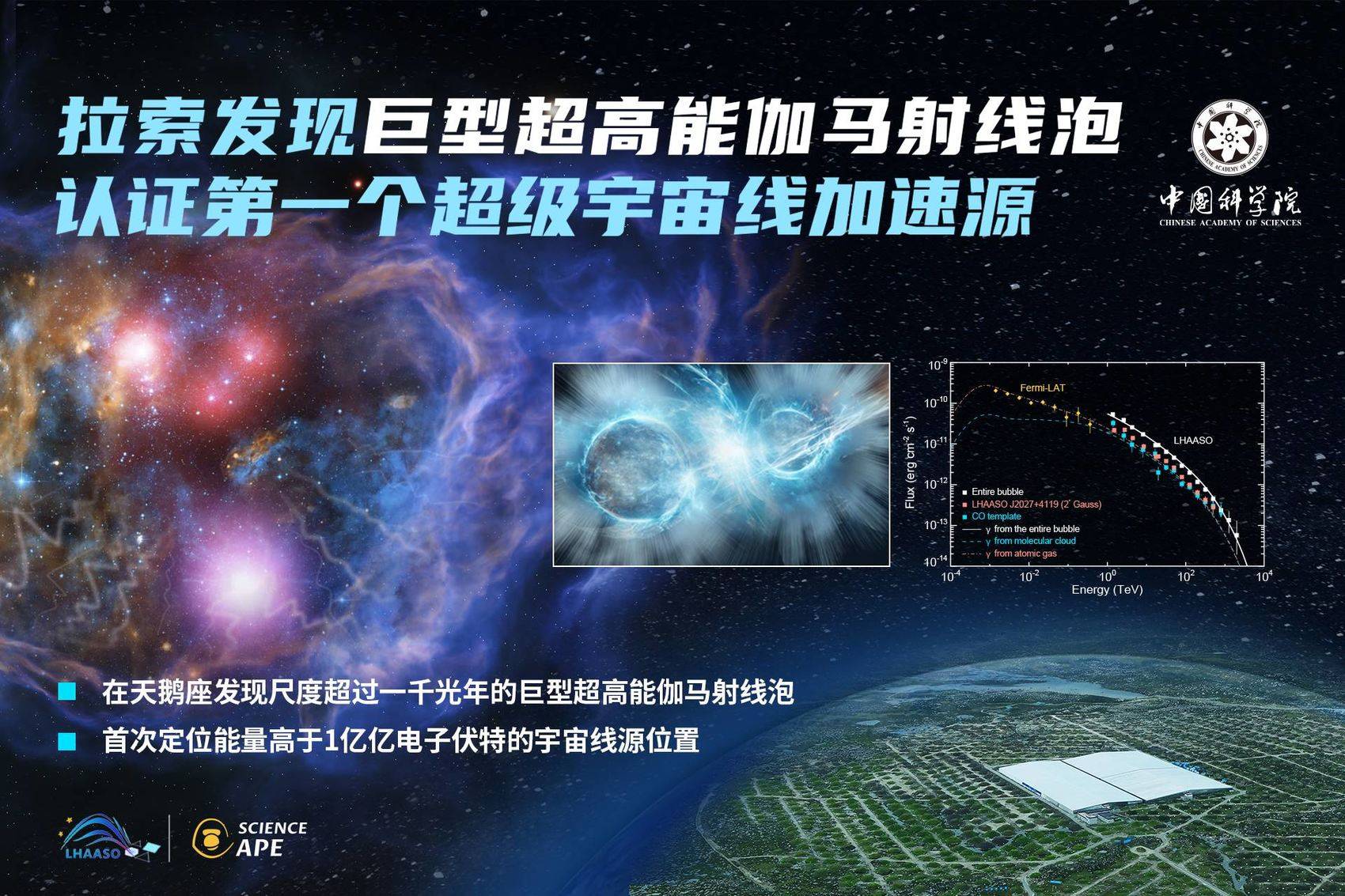 春節(jié)過后,甘孜州稻城縣海拔4410米的海子山上,以宇宙線觀測研究為核心的國家重大科技基礎(chǔ)設(shè)施——高海拔宇宙線觀測站(LHAASO,“拉索”)傳來又一重大發(fā)現(xiàn):在距離地球5000光年左右的天鵝座恒星形成區(qū),發(fā)現(xiàn)了一個(gè)巨型超高能伽馬射線泡狀結(jié)構(gòu),是歷史上首次找到能量高于1億億電子伏的宇宙線的起源天體。