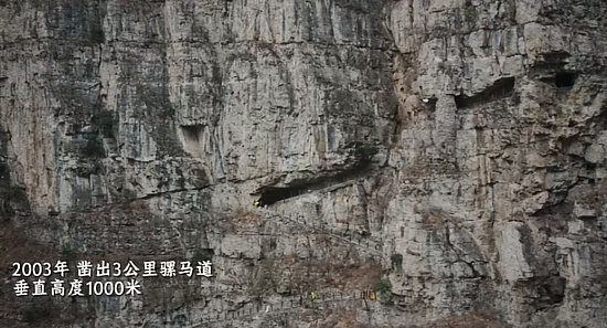 2003年當(dāng)?shù)卣疄榇迕裨诮^壁上鑿出一條長3公里,垂直高度近1000米的騾馬道,方便村民出行。