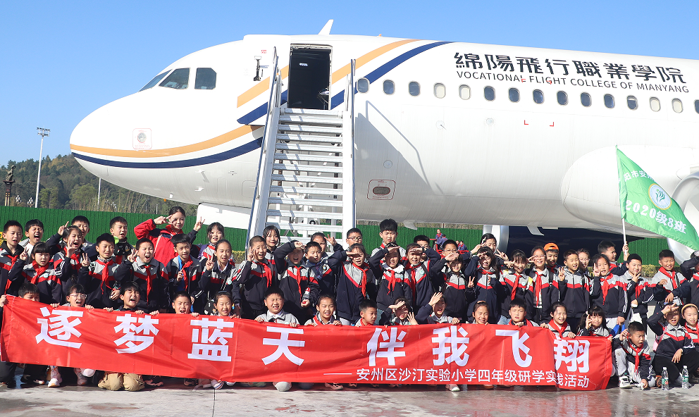 3月28日,安州區沙汀實驗小學開展了以“筑一個翱翔藍天的夢”為主題的2020級“全景艙”沉浸式航空主題研學活動。2020級480余名師生走進綿陽飛行職業學院中國民航科普教育基地,沉浸式體驗值機、候機、登機、乘機、迫降、維修等全真模擬場景。