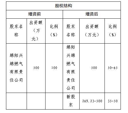 綿陽能投置業有限公司增資擴股項目已由綿陽燃氣集團有限公司董事會審議通過,現將增資擴股事項公告如下: