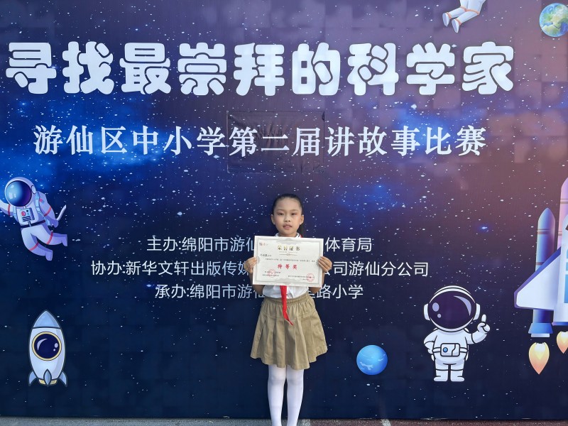 決賽現場,游仙區劍南路小學三年級二班何姝穎同學以激昂的語調、生動的案例,講述了時代楷模----南仁東追求真理、勇攀科學高峰的感人故事;分享了這位科學家無私奉獻,為人類進步作出巨大貢獻的感人瞬間。故事飽含對南仁東精神的追求與傳承,激勵在場的每一位評委和觀眾。經過激烈角逐,何姝穎同學最終在決賽中拔得頭籌,獲得最高獎項“特等獎”。