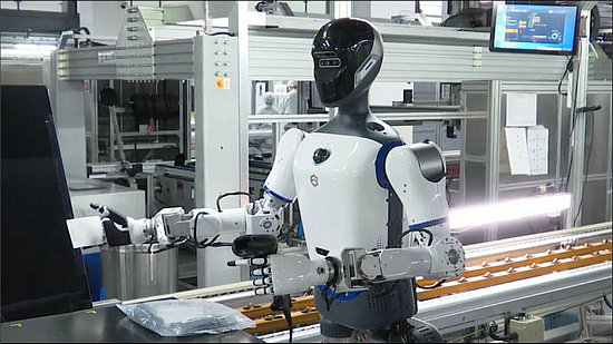 7月16日,綿陽長虹智能制造產業園,“綿陽造”人形機器人上崗“實習”,在“裝配工”崗位進行物料搬運和掃碼貼簽等工作。