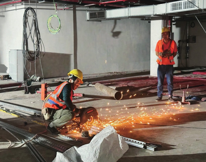 近日,記者走進綿陽科技城新區直管區高技術產業園項目現場看到,大型機械設備來回穿梭,建筑工地處處是忙碌的身影。負責玻璃幕墻打膠的工人丁志軒戴好安全護具、帶上水杯乘坐升降梯來到建筑外立面上。