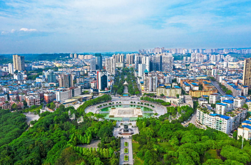 廣安城區(qū),外圓內(nèi)方的思源廣場(chǎng),從空中俯瞰仿佛一個(gè)巨大輪子。這個(gè)意象恰似一個(gè)隱喻:驅(qū)動(dòng)“前進(jìn)之輪”,廣安逐浪前行!