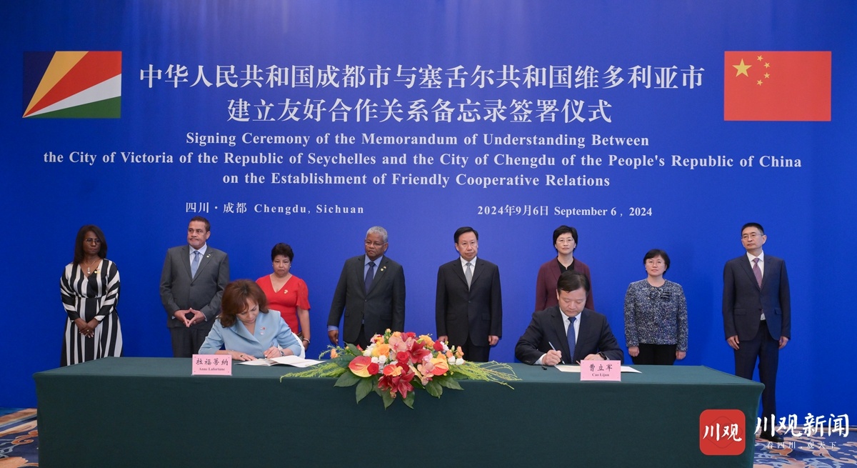 隨后,省委常委、成都市委書記曹立軍和塞舌爾駐華大使拉福蒂納分別代表雙方簽署《中華人民共和國成都市與塞舌爾共和國維多利亞市建立友好合作關系備忘錄》。