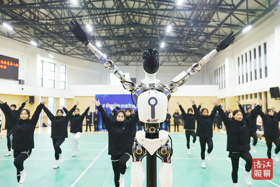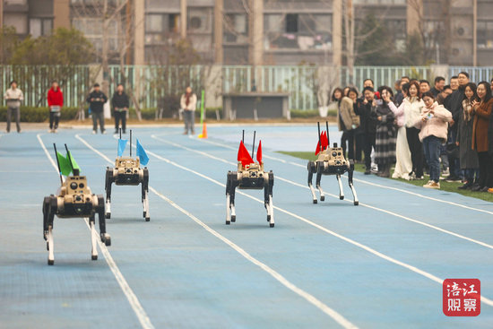 在人機共舞環節,綿陽實驗高級中學健美操隊運動員與天鏈機器人T1默契配合,整齊劃一的動作展現了人機融合的和諧美感。在百米比賽中,四只身披彩旗的四足機器人——兵裝自動化所公司機器狼向著終點快速前進,小家伙們可愛的模樣和賣力奔跑的樣子讓現場觀眾驚嘆不已。