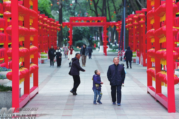各大公園也是詩情“畫”意年味濃,讓市民感受到濃郁的“中國年”和“綿陽味”。在人民公園主干道“春木青蛇年”百米燈籠墻前,市民們紛紛拍照留影。文化廣場、臨園路北大門兩側(cè)安裝的64棵LED樹燈,川西北第一公園標(biāo)識處、文化廣場垂絲海棠等沿線牽掛裝飾串燈2000余串,一組組燈籠墻和燈謎小品,營造出絢麗多姿的夜景。初一到初七,人民公園里熱鬧的火壺表演、機(jī)甲游園、大唐鼓舞以及舞龍舞獅等輪番上演,“好多年沒在城里看到舞龍舞獅了,好期待。”在人民公園正帶著孩子拍照的市民呂女士告訴記者。