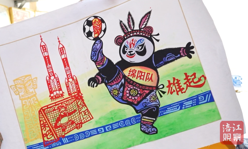 “你看,這個熊貓川超娃娃正在完成足球賽事中經典的倒掛金鉤動作。”蘭小奇指著作品中的熊貓形象介紹,“它頭戴白馬藏族頭飾、身著羌族服飾,既體現四川多民族特色,又暗含‘足球無界’的寓意。背景里,火箭圖案代表綿陽科技城,青銅面具元素象征三星堆文化,‘綿陽來吧’的書法字樣則是向八方來客發出的邀請。”