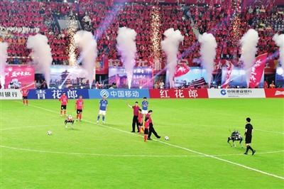 此次比賽的開球嘉賓是“中國原子彈之父”鄧稼先之子鄧志平、“中國氫彈之父”于敏之子于辛。他們乘坐來自科技城新區(qū)的無人駕駛公交車入場,“綿陽造”警用機(jī)器狼和消防機(jī)器狼馱載著比賽用球緊隨其后。綿陽科技城的科技元素成為當(dāng)晚的一大亮點。