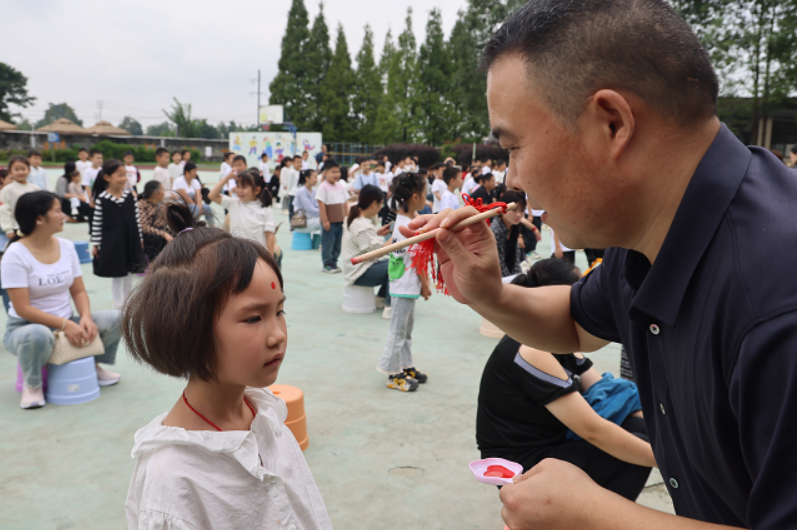下午1時,活動在莊重而溫馨的氛圍中拉開帷幕。一年級新生在老師的引領下,依次穿過象征智慧與希望的“啟智門”,標志他們正式踏上求學問道的新征程。緊接著,孩子們在小主持的指揮下,有序完成系列活動:正衣冠,行謝禮,朱砂啟智將儀式推向小高潮,“痣”通“智”,意為開啟智慧。隨后,激昂的師生擊鼓鳴志環(huán)節(jié),聲聲鼓響傳遞著孩子們遠大的理想與志向。活動最后,全體新生齊聲誦讀經典篇章,稚嫩而響亮的誦讀聲在校園回蕩,展現了中華文化的深厚底蘊與傳承力量。