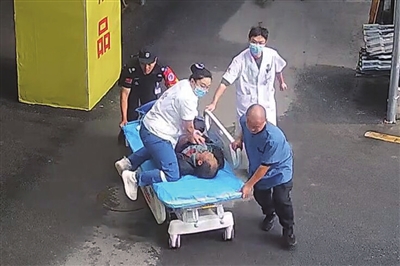 張莎跪在平車上搶救患者