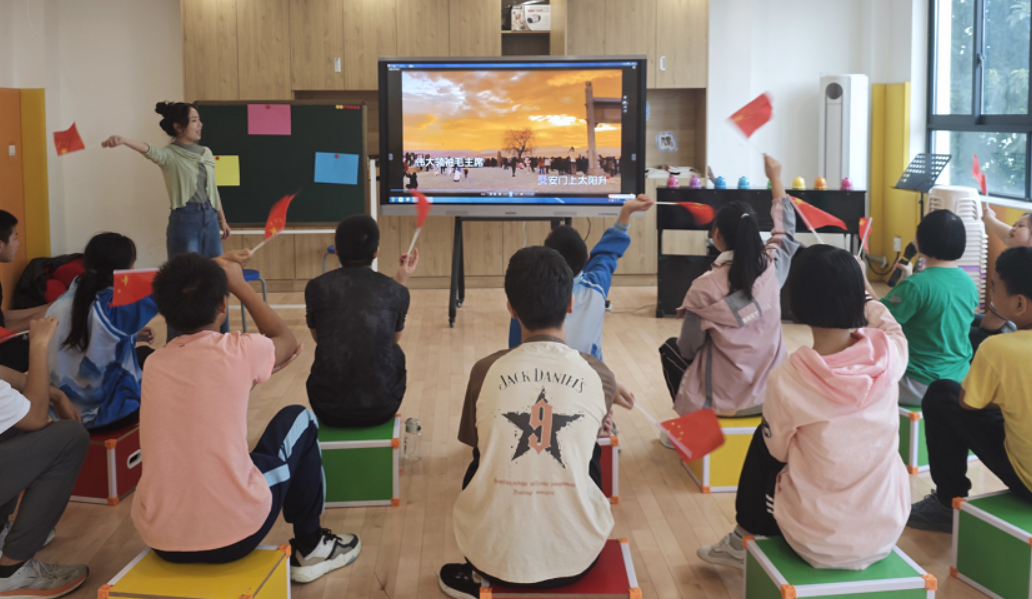 隨后,各班開展“共慶祖國華誕”主題班會。通過講述愛國故事、播放紅色影視片段等形式,讓學生感受祖國的歷史與榮光。學生們用手勢、畫作和簡單詞匯表達對祖國的認識與情感,“天安門”“五星紅旗”成為他們心中祖國的象征。