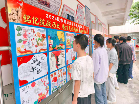 作品完成后,歷史組老師們利用休息時間,對優秀作品進行了篩選和整理,并精心設計、布置了專題展板。展板一經展出便吸引了眾多師生駐足觀看。課間時分,同學們或凝神細讀,或低聲交流,在一筆一畫、一文一圖中感受歷史的厚重與民族的堅韌。這道獨特的“風景線”,不僅美化了校園環境,更營造了“時時受教育,處處受熏陶”的濃厚學習氛圍,讓歷史知識“活”了起來,讓民族精神“立”了起來。