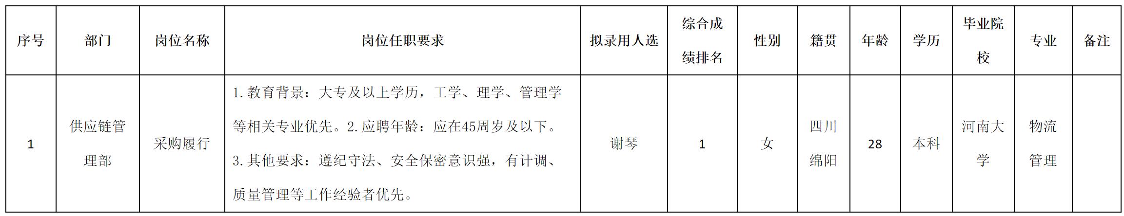 根據(jù)四川九州電子科技股份有限公司發(fā)布的招聘公告及招聘相關(guān)規(guī)定,經(jīng)測(cè)試、考察、體檢等程序,擬錄用謝琴同志到四川九州電子科技股份有限公司工作,現(xiàn)予以公示,具體情況如下:
