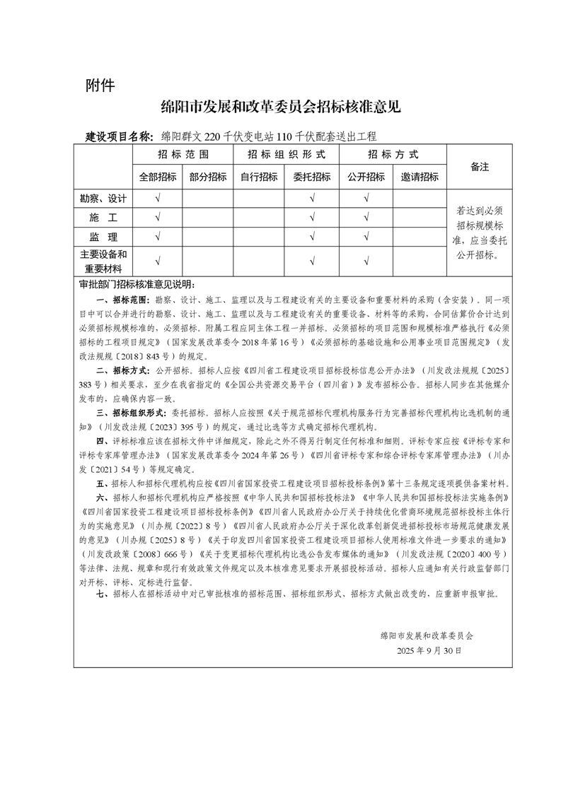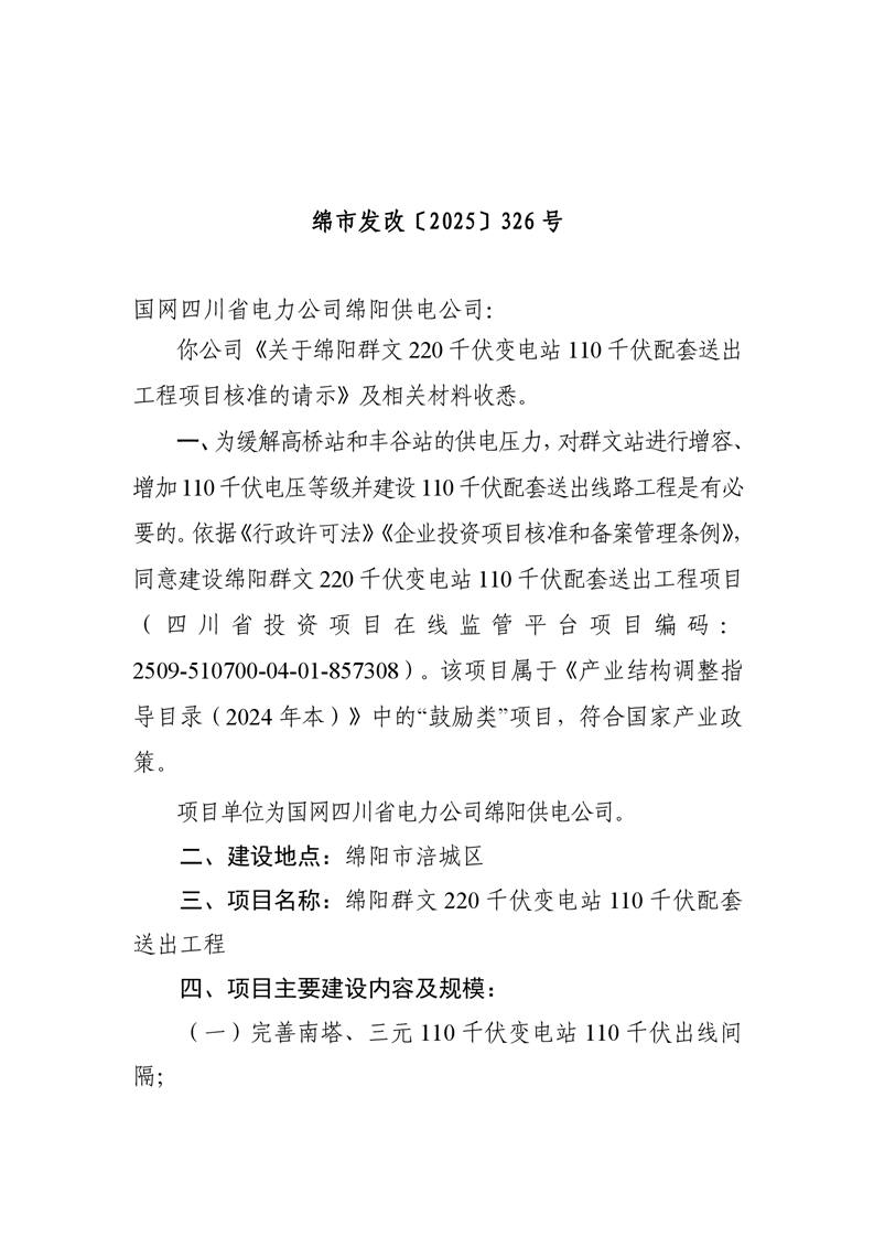 綿陽市發展和改革委員會關于綿陽群文220千伏變電站110千伏配套送出工程項目核準的批復