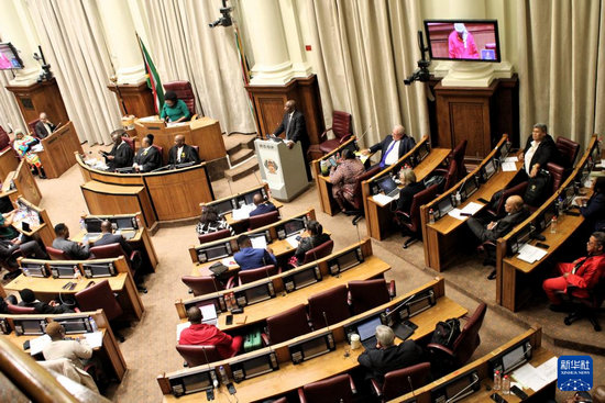 10月14日,在南非開普敦,南非總統拉馬福薩在南非全國省級事務委員會(即議會上院)回答議員提問。新華社發(沙姬拉·泰比 攝)