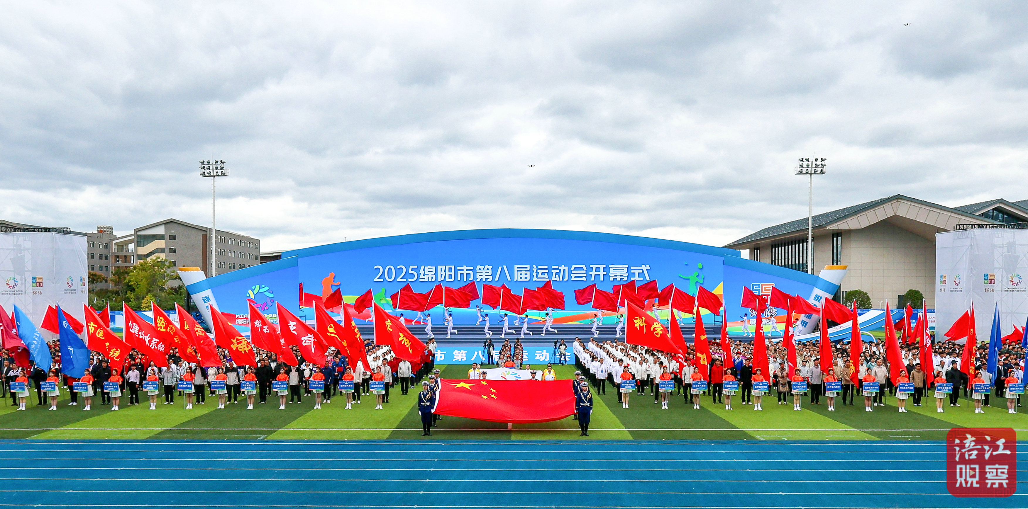 14時30分,綿陽市第八屆運動會開幕式正式開始。伴隨著激昂澎湃的旋律,國旗護衛隊高舉著五星紅旗步入會場,鐫刻著八組躍動人形環抱構成的綿陽市第八屆運動會會旗緊隨其后。裁判員、各代表團及方隊邁著矯健步伐依次入場,充分展示了綿陽人民昂揚向上、奮發有為的精神面貌。入場式后,全場起立,齊聲高唱中華人民共和國國歌。在雄壯國歌聲中,鮮艷的五星紅旗冉冉升起,迎風飄揚。