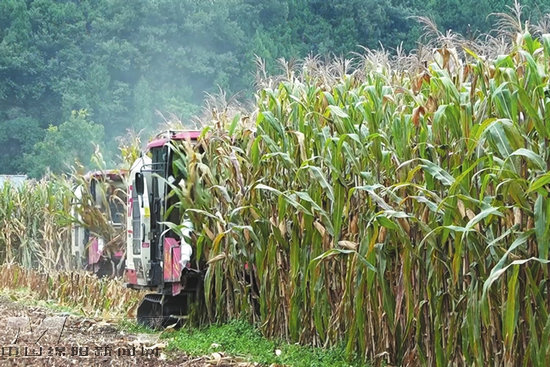 近日,在梓潼縣文昌鎮龍口村,一臺臺履帶式收割機在玉米地里來回穿梭。玉米稈整齊卷入,在剝去玉米穗的苞葉后,再通過脫粒裝置分離金黃的籽粒與穗軸,最后將籽粒篩選干凈,順著管道涌入隨行的運輸車,再拉到烘干房烘干。秸稈則被粉碎切割成細碎的草屑,均勻地撒向田間,化作滋養土地的天然肥料。