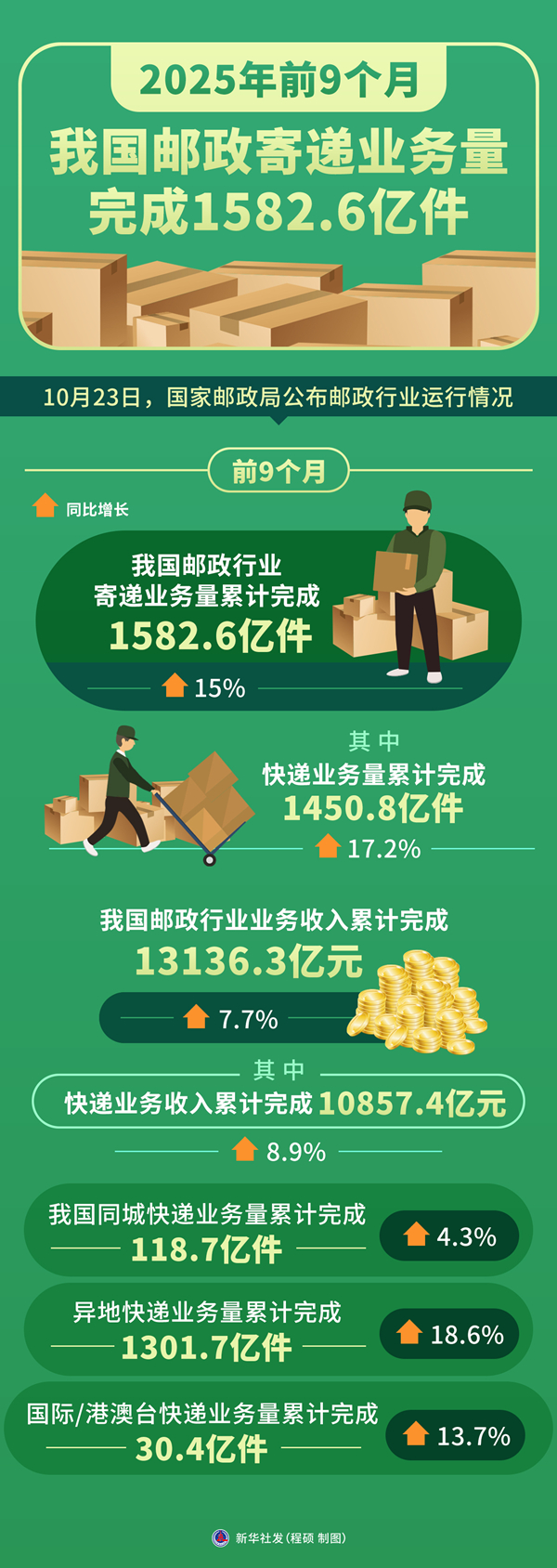 新華社北京10月23日電(記者葉昊鳴)記者23日從國家郵政局獲悉,前9個月,我國郵政行業(yè)寄遞業(yè)務量累計完成1582.6億件,同比增長15%。其中,快遞業(yè)務量累計完成1450.8億件,同比增長17.2%。