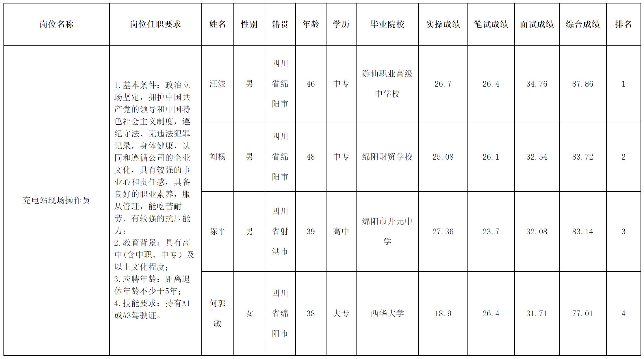 根據綿陽耀鴻交通職業培訓有限責任公司發布的招聘公告及招聘相關規定,經實操、筆試等程序,現將實操、筆試(面試)成績予以公示。