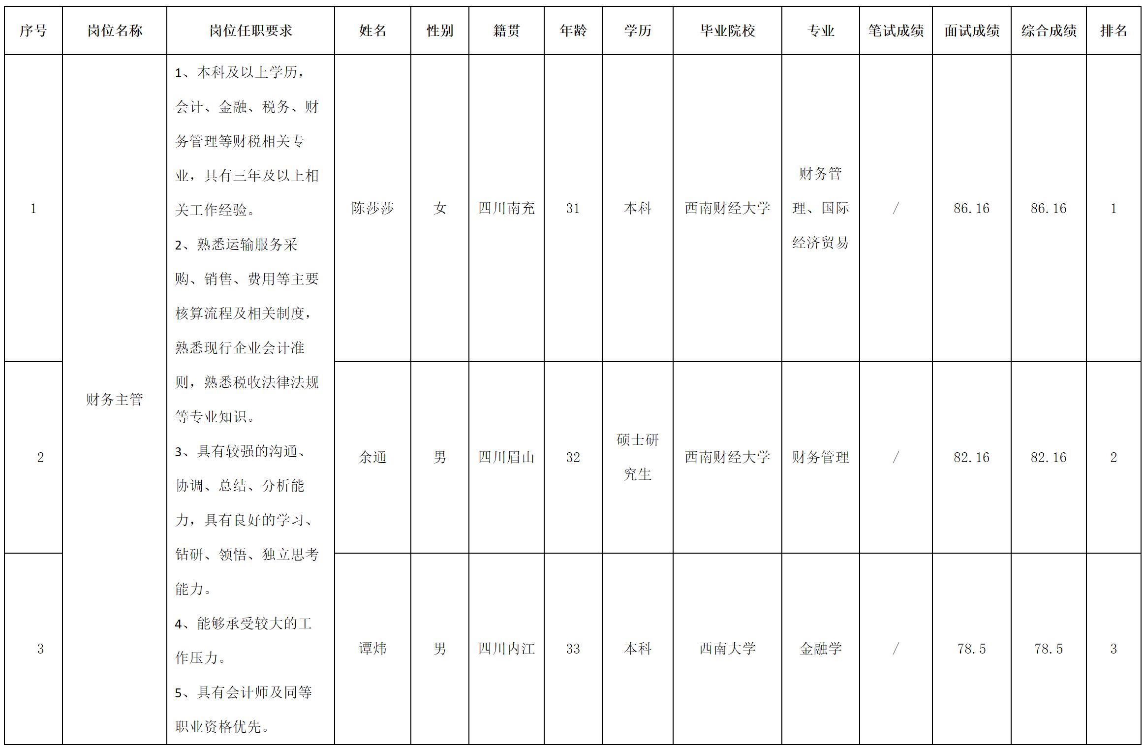 根據(jù)四川長(zhǎng)虹民生物流股份有限公司發(fā)布的招聘公告及招聘相關(guān)規(guī)定,經(jīng)面試等程序,現(xiàn)將成績(jī)予以公示。